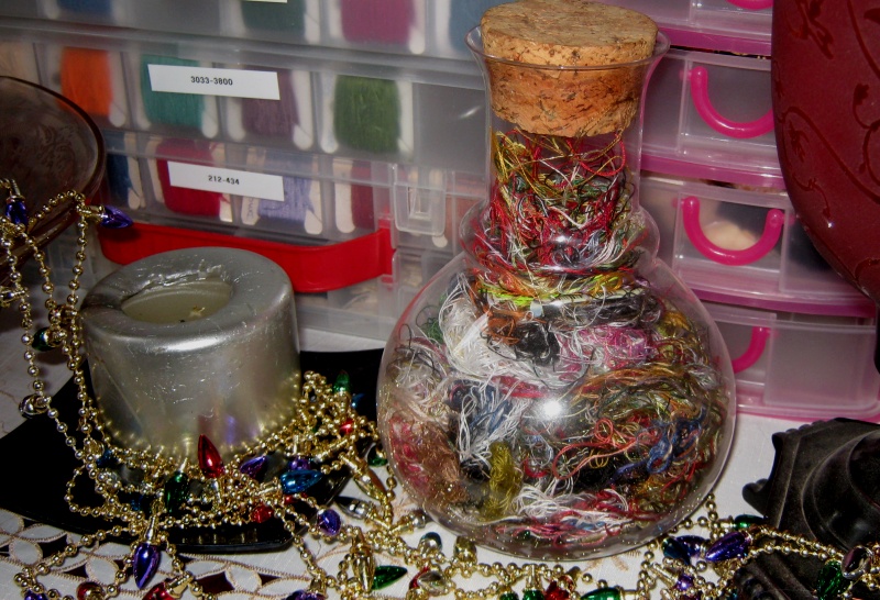 Find a clear container. Some use a bowl, some a jar. Mine is a small decanter with a cork top that I picked up at a thrift shop for a couple of dollars. Each time you clip your floss ort, toss it into the container. Keep it in a spot where you'll see it to remember to collect it - at least for the first few months - soon it will be a matter of habit to collect these threads.