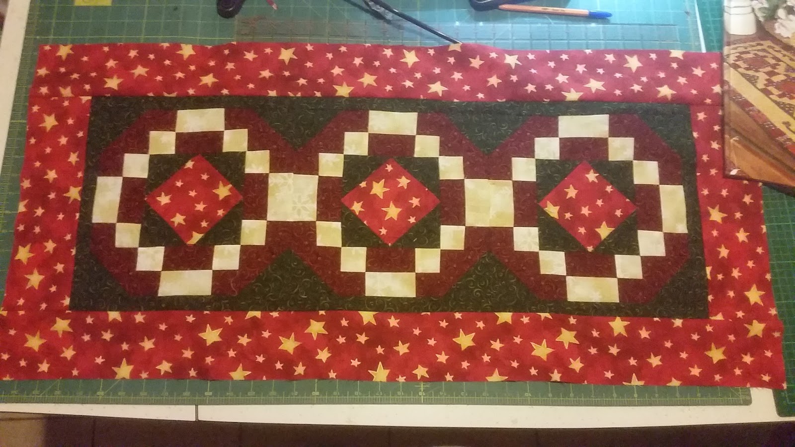 My cross stitch pieces are waiting forlornly to return, and, given time and daylight and good eyesight, I will. In the meantime, my sewing maching, rotary cutter and rulers have become quite good friends. I particularly love the instantaneous result. Cross stitching built up over weeks and weeks of work, and I often fell asleep after a dozen or so stitches. With patchwork, I can complete a small project in a matter of hours, or prepare the fabric one day, and stitch it the next.